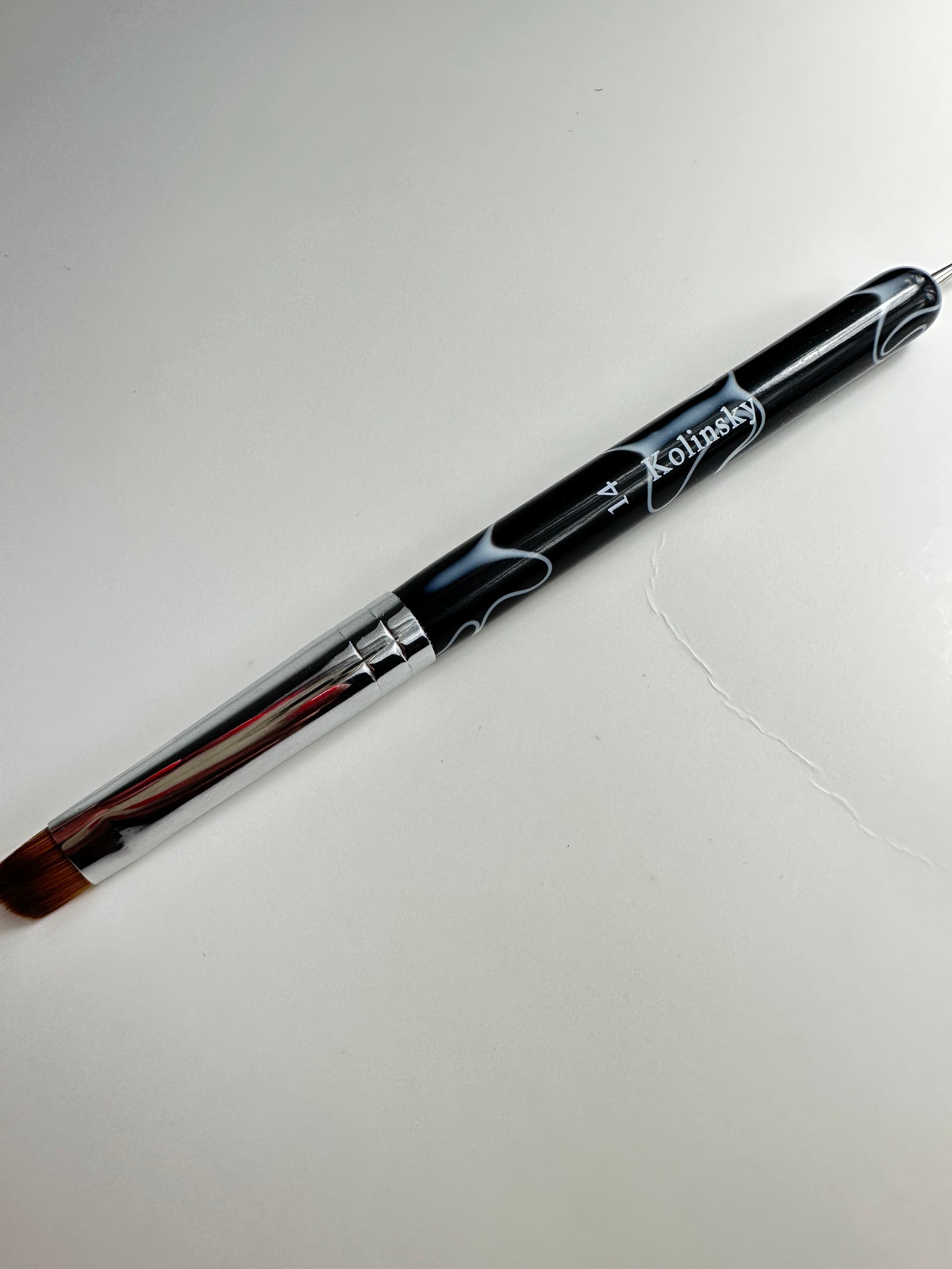 This real Kolinsky 100% POLYGEL Brush and Nail Cleaning Brush is the perfect tool to help you apply dots and marbling to your clients' nails. It is available in size 14 and 16, in Black. The brush measures 6" long and is ideal for detailed nail art.