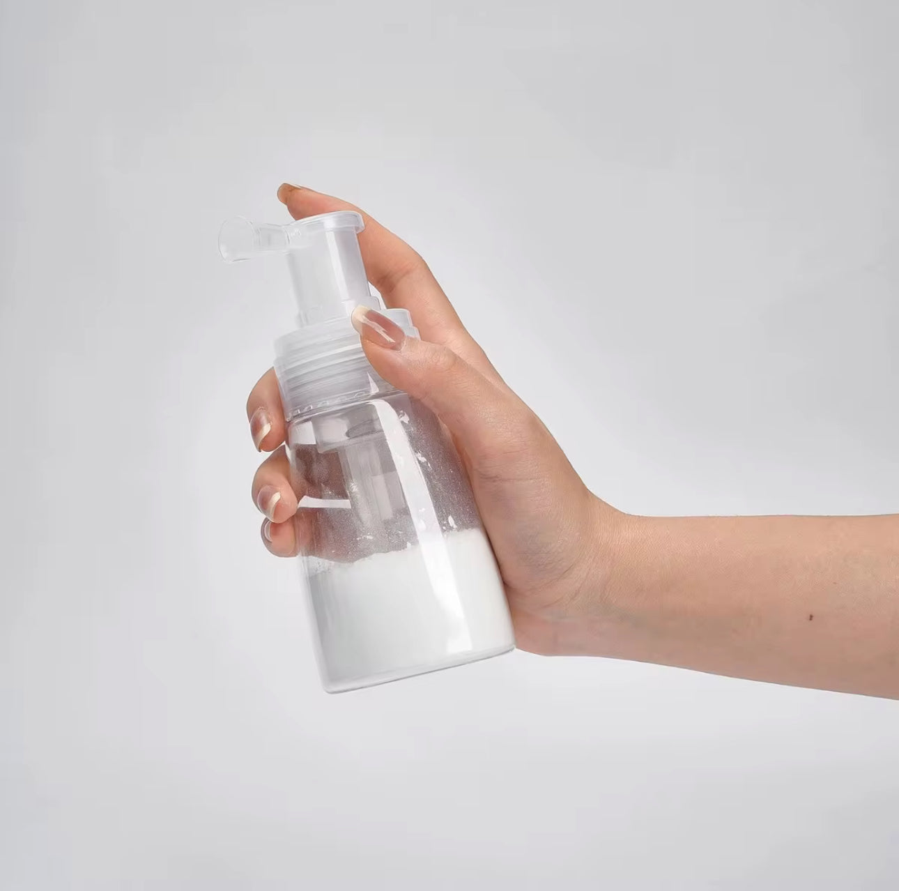 Con este pomo sale la cantidad necesaria que necesita la piel de talco no exceso .